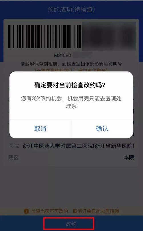 改约不用重新跑医院现场,手机点点即可完成。打开“检查预约”应用,点击“预约记录”,依次选择需要改约的检查项目、做检查的时间即可完成改约。需要注意的是,检查时间最多只能修改3次。
