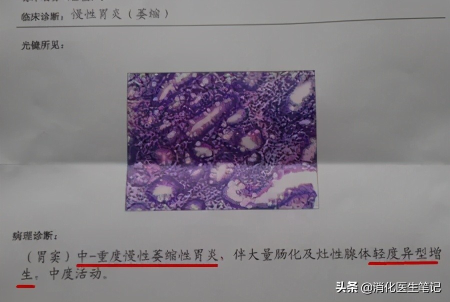 例如我们常见的病理报告:“慢性炎症(++),肠化(+++),不典型增生(+),活动性(++),Hp(-)”,或“黏膜慢性炎,中度活动性,伴有局灶肠化,轻度不典型增生”,或“慢性萎缩性胃炎,重度,中度肠化,部分区域重度不典型增生”等。
