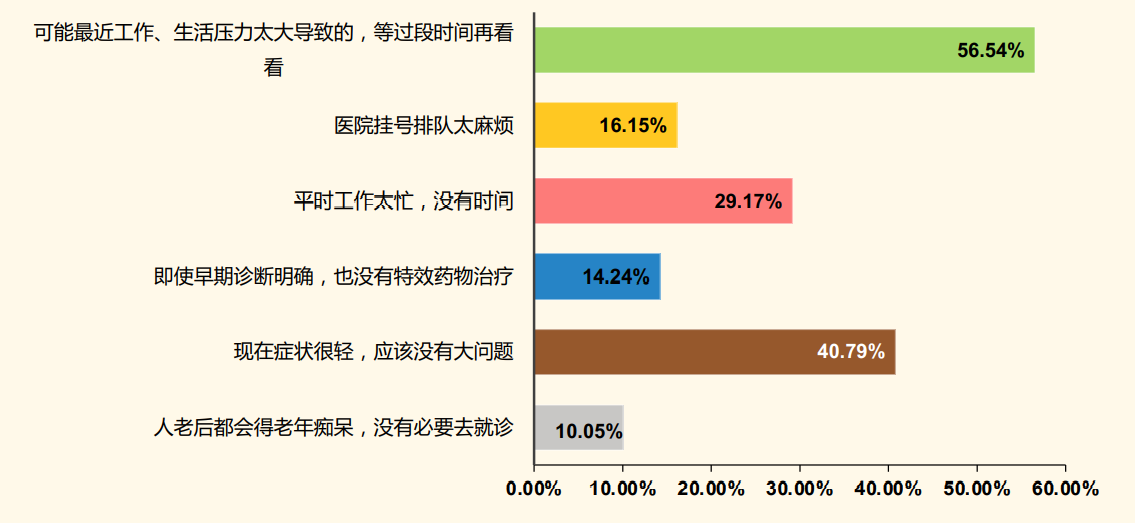 主动就诊率低的原因包括“认为是工作、生活压力大导致,过段时间就好了”“工作太忙,没有时间”“认为症状很轻,应该没大问题”“即使诊断明确,也没药物治疗”等,甚至有人认为,人老后都会得老年痴呆,没必要就诊。