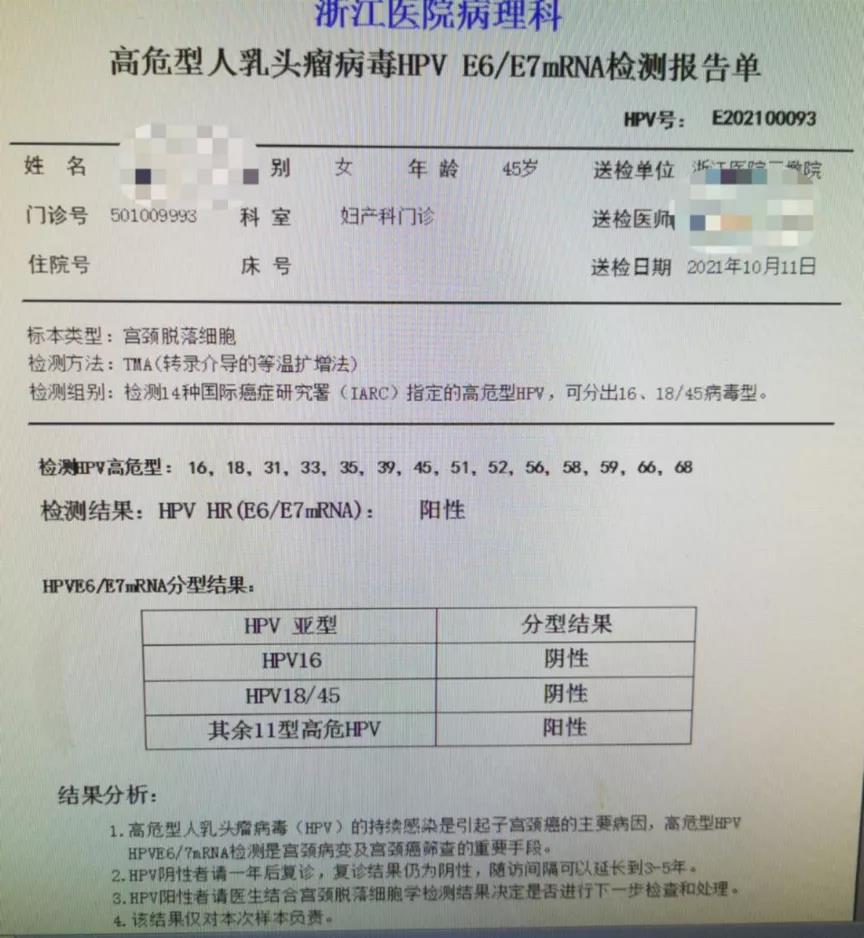 忐忑不安中,小杨等来了E6/E7mRNA结果的阴性报告,总算放了心!