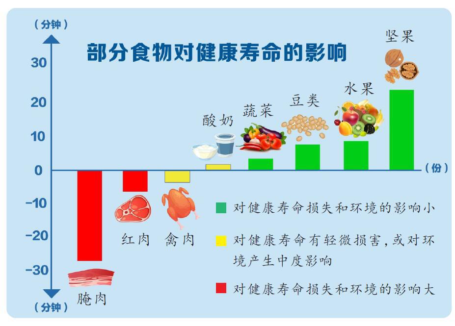 近日,一项发表在《自然-食品》杂志上的研究评估了5800多种食物,并根据它们对健康寿命和环境的影响进行了排名。健康寿命方面,主要基于“健康营养指数”——一个“改编”自全球疾病负担的指数;环境方面,研究团队考虑了生产、加工、消费、浪费和细颗粒物排放等多个因素。结果发现,每份食物对健康寿命的影响,从减少74分钟到增加80多分钟不等。例如,吃一份牛肉热狗可能会使健康寿命缩短36分钟,吃一份蔬菜披萨则会损失1.4分钟健康寿命;而吃一份腰果会延长26分钟,一份番茄酱沙丁鱼最多可延长82分钟;如果用水果、蔬菜、坚果、豆类、海鲜组成的“大杂烩”,代替牛肉、加工肉类热量摄入的10%,不仅能延长48分钟的健康寿命,还能减少1/3与饮食相关的碳足迹。