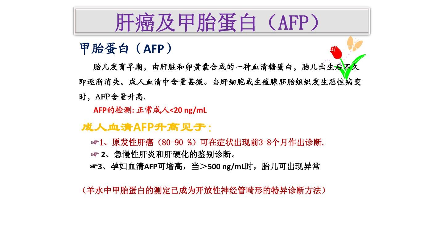 *相比较其他标志物,AFP属于相对特异性的指标,血清 AFP 是临床上辅助诊断原发性肝癌最常用的肿瘤标志物。对于血清 AFP≥400μg /L 超过4周,或≥200μg /L 持续8周,在排除妊娠、活动性肝病和生殖系胚胎源性肿瘤后,应高度怀疑肝癌,需做B超检查,必要时做 CT/MRI 和活组织检查等明确诊断。血清AFP对肝癌诊断的阳性率一般为70%左右,有约30%的肝癌患者AFP检测是阴性的,肝癌中的肝内胆管细胞癌通常AFP不高。