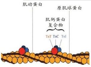 肌钙蛋白(Tn)是肌肉组织收缩的调节蛋白,位于收缩蛋白的细肌丝上,在肌肉收缩和舒张过程中起着重要的调节作用;含有3个亚型:快反应型、慢反应型和心肌肌钙蛋白(cTn)。前两者与骨骼肌相关,而心肌肌钙蛋白则仅存在于心肌细胞中,是由肌钙蛋白T(cTnT)、肌钙蛋白I(cTnI)、肌钙蛋白C(cTnC)三种亚单位组成的络合物。cTnT和cTnI是心肌细胞特有的抗原,cTnI分子量约为23.88 KDa,在心肌细胞损伤时从心肌纤维上降解下来。血清中cTn升高反映了心肌细胞受损,其特异性与敏感性均高于以往常用的心肌酶谱。