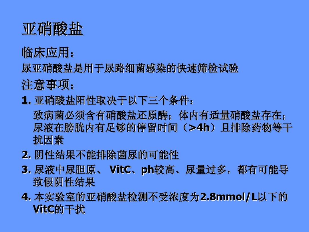 注意:若尿路感染细菌不能使硝酸盐还原为亚硝酸盐,或尿在膀胱中存留较短,或尿中缺乏硝酸盐,也会产生阴性结果。