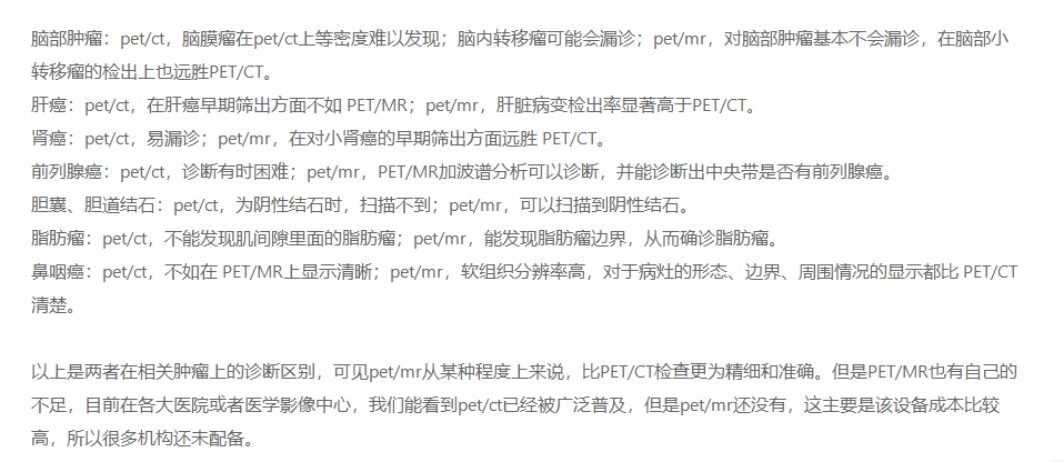 PET-MR扫描当中的MRI可提供人体内部器官的准确的结构图像,而PET显示出了细胞在人体内的新陈代谢活动。通过PET-MR,在一次扫描中,同时获得MRI和PET两个图像,对浑身以及特定身体区域进行细致的检查。不仅如此,由于核磁共振检查的特异性,可侦测任何解剖结构异常,不仅诊断恶性肿瘤,尚包括良性肿瘤、退化、结石和发炎等问题,尤其是某些可能会恶性化、须及早处理的良性病灶,对本质器官癌症的分期、胰、肝、胆、乳房、脾、治疗追踪有帮助(如:脑、转移病灶的侦测、生殖器官、肾等),并且还可以早期检测出阿尔茨海默氏痴呆症(俗称老年痴呆)并与其它原因造成的痴呆症识别开来。和其它的扫描相比,对于比如肌肉此类的软组织有着更为清晰的显像。