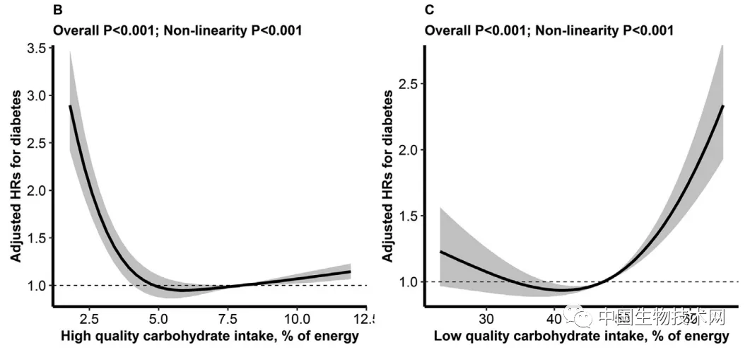 高质量碳水化合物摄入与新发糖尿病之间存在L型关联;低质量的碳水化合物摄入与新发糖尿病存在J型关联(见下图)。