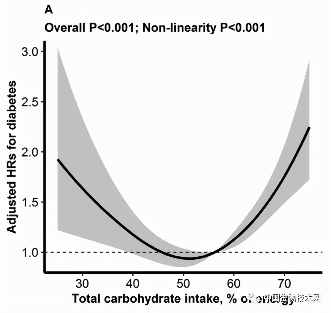 在平均9年的随访期间,1100名参与者罹患糖尿病。研究人员发现,低质量碳水化合物是碳水化合物摄入的主要来源,占碳水化合物摄入量的82%。总的来说,碳水化合物摄入的能量百分比与新发糖尿病之间存在U型关系,摄入在49-56%时,新发糖尿病的风险最低(见下图)。