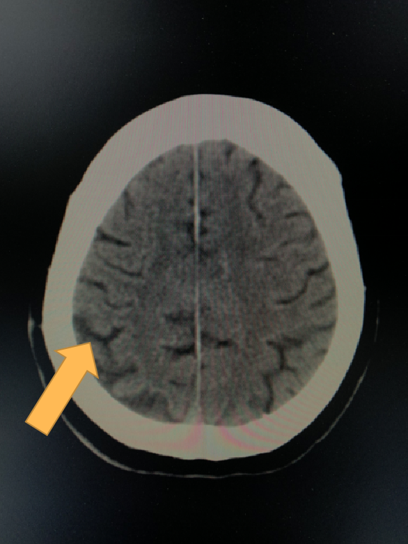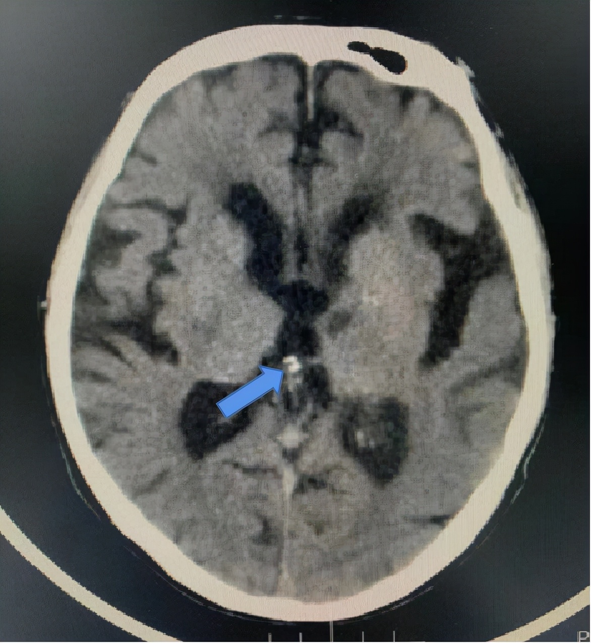 脑,松果体钙化(箭头所指,白色,结节状)。病例同时存在脑白质脱髓鞘,脑萎缩,腔梗。