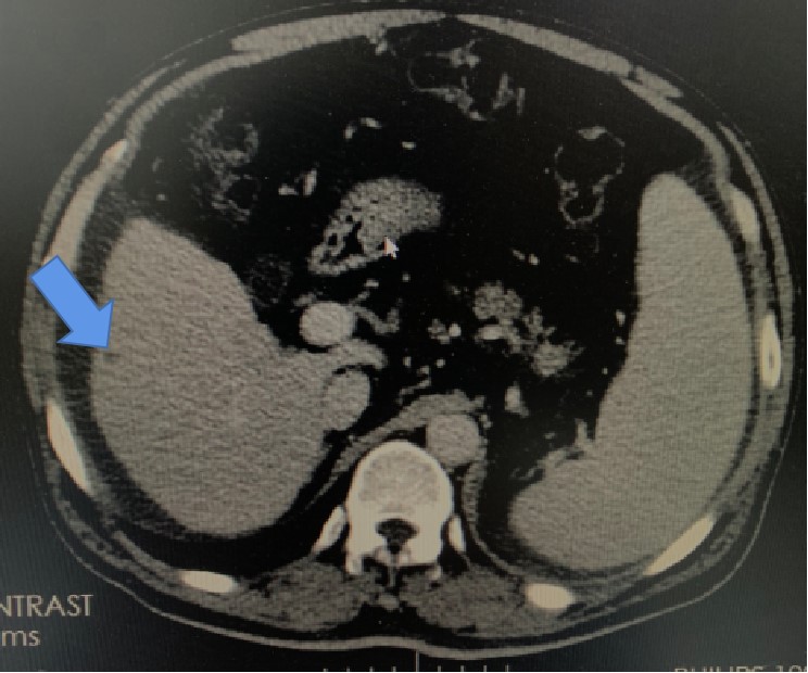 肝右叶小囊肿(箭头所指,小灶状,偏黑色部分)。