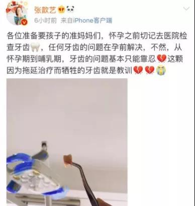 张歆艺在微博上发文,告诉我们的准妈妈,怀孕前检查牙齿的重要性。