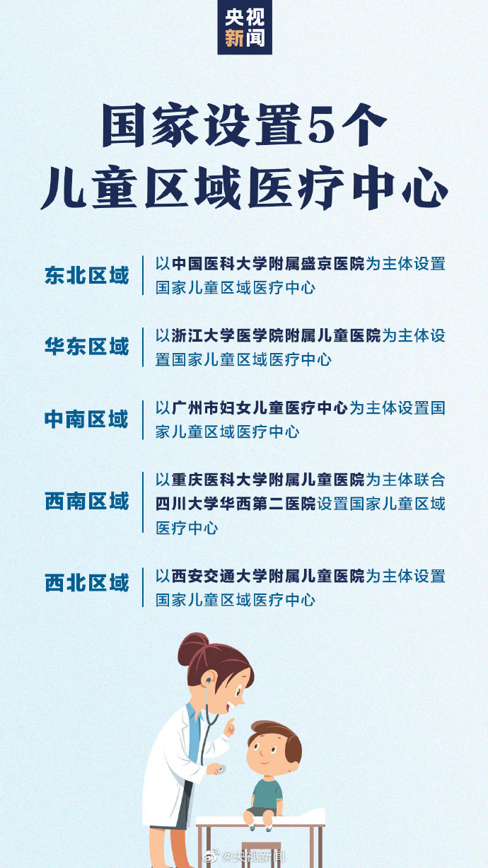 近日,国家卫健委发布通知,明确以6家三级甲等儿童医院为主体,分别在东北、华东、中南、西南和西北区域设置国家儿童区域医疗中心,提高区域内儿童医疗、教学、科研及预防保健服务水平,促进区域间儿科医疗服务同质化。