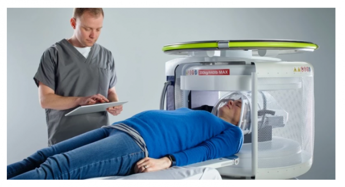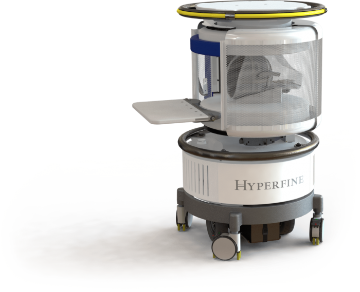 核磁共振成像机中的磁感应强度是用一个叫做特斯拉(T)的计量单位来跟踪的。Hyperfine的新型POC机器的磁感应强度明显更小,只有0.064T。这意味着该设备可以轻松地被放置在病人的床边,而无需在周围环境中部署任何保护措施。该机器的耗电量也比大型MRI机器少,可以从标准的墙上插座供电。