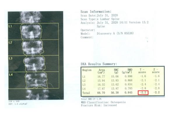 足部超声的结果显示骨密度测量值是-2.19 。作为医学专业出身的小编,并不太相信这个结果,因为超声骨密度的结果可能并不是非常精确。为了能让自己安心,小编特地在某三级医院接受了更为精确的双能X线骨密度检测 。然而,结果如下: