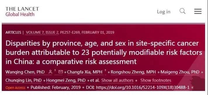 ①Chen W, Xia C, Zheng R, et al. Disparities by province, age, and sex in site-specific cancer burden attributable to 23 potentially modifiable risk factors in China: a comparative risk assessment[J]. The Lancet Global Health, 2019, 7(2): e257-e269.