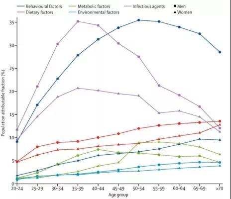 3. 饮食因素和环境因素的可归因比例都随着年龄的增长而增加。
