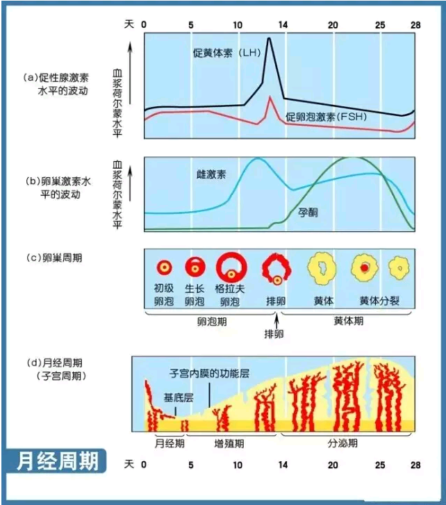 雌激素即雌二醇:由卵巢的卵泡分泌,主要功能是促使子宫内膜转变为增殖期和促进女性第二性征的发育