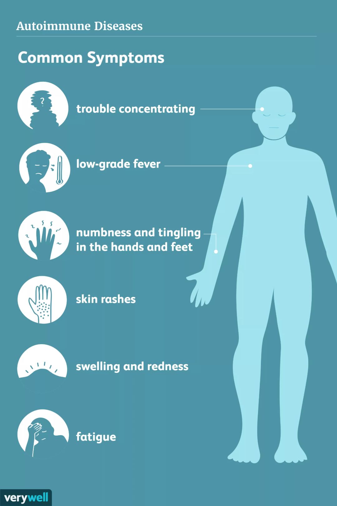 虽然常见的自身免疫性疾病的症状可能由于受影响的器官的不同而有很大的不同,但是这类疾病通常有着一些共同的症状,包括: