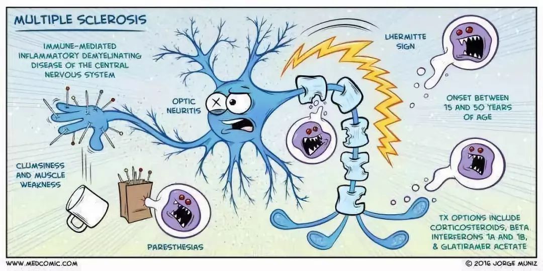 多发性硬化是一种自身抗体攻击神经元外部的脂肪鞘(髓鞘)的疾病。根据受影响的神经系统的特定区域,多发性硬化可能有许多不同的症状,包括视力问题、感觉障碍(比如麻木和刺痛)、膀胱问题、虚弱、协调障碍和震颤等等。严重情况下,可能导致瘫痪。