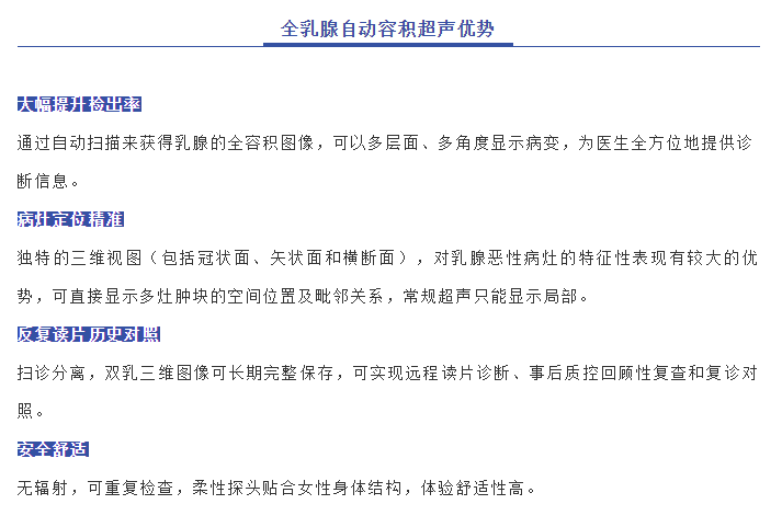 目前乳腺癌早期筛查方法中,自动乳腺容积超声在提高致密性乳腺(调查显示,亚洲大约60%的女性都是致密性乳腺,40-49岁的中国女性中,75%-80%的女性乳腺是致密性的)的癌症检出率方面有着明显优势。