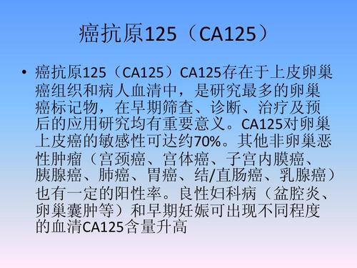 2、癌抗原125主要存在于卵巢癌中,尤其是病理类型为上皮癌患者,CA125浓度可以明显升高,对于早期诊断卵巢癌有一定的提示意义,另外对于卵巢癌的疗效监测和是否复发有一定的指导意义。