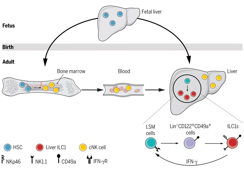 科学发现:发现了成年肝脏造血前体细胞向肝脏ILC1(即肝脏定居NK细胞)的分化潜能及调控机制。揭示了固有淋巴细胞的骨髓外发育新路径,也为阐释肝脏天然免疫优势状态的成因提供了理论依据。