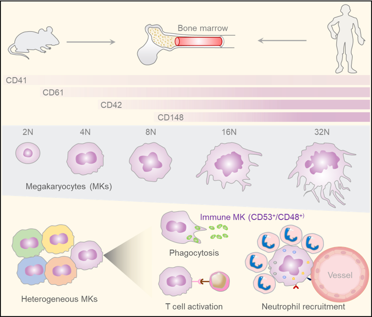 科学发现:突破了成年骨髓高倍体巨核细胞的技术瓶颈,绘制了成年小鼠和成人骨髓巨核细胞的单细胞转录组图谱,解析了成年骨髓巨核细胞的异质性及分化规律,鉴定到巨核细胞免疫亚群。揭示了免疫巨核细胞的功能,为研究疾病条件下巨核细胞的亚群组成和功能变化提供了重要参考。