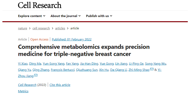 前期关于代谢基因的研究,提示了三阴性乳腺癌具有显著的代谢紊乱,有进一步深入研究的必要。因此,邵志敏教授、江一舟教授团队继续深入挖掘三阴性乳腺癌代谢物的特征。