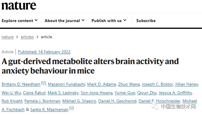 2022年2月14日,发表在《Nature》上的一项新研究中,来自美国加州理工学院陈天桥雒芊芊脑科学研究院微生物学教授Sarkis Mazmanian领导的研究团队发现了肠道和大脑之间传递的分子信息:一种肠道细菌产生的小分子代谢物可以进入小鼠大脑并改变脑细胞功能,从而导致动物的焦虑行为加剧。该研究为肠道菌群变化与复杂情绪行为之间的联系供了分子水平的证据。