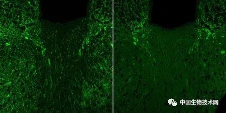 左图:正常生成髓鞘的小鼠大脑(髓鞘染为绿色)。右图:在4EPS存在的情况下,髓鞘形成受阻,这些小鼠表现出类似焦虑的行为