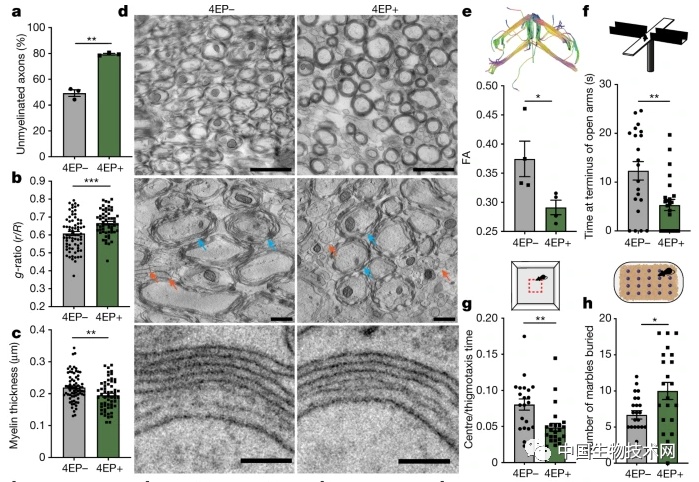 研究人员观察到,在存在4EPS的情况下,少突胶质细胞的成熟度较低,因此产生的髓鞘较少,导致轴突周围的绝缘层变薄,从而出现动物焦虑行为。