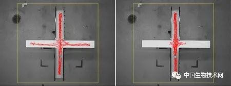 红线表示小鼠移动的路径。左图:没有4EPS的小鼠探索整个新区域。右图:存在4EPS的小鼠只会待在新环境中的覆盖区域,这表明了它们的恐惧或焦虑