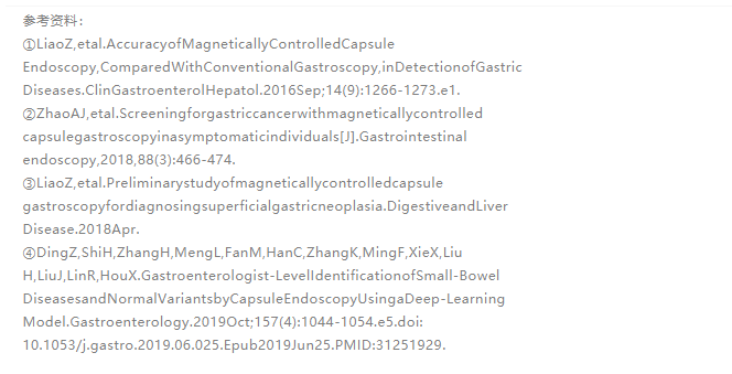 临床循证研究表明,安翰磁控胶囊胃镜的检查准确性与电子胃镜“金标准”高度一致①,其适用于无症状体检人群的胃癌筛查②,能够很好地诊断浅表性胃肿瘤③,同时,人工智能技术大大提高了诊断效率④,上述研究结果都已在国际权威学术期刊上公开发表,代表着世界先进水平。