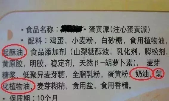 注意:配料表中出现“氢化”、“精炼”、“人造”、“植物”、“起酥”等字眼时要提高警惕。