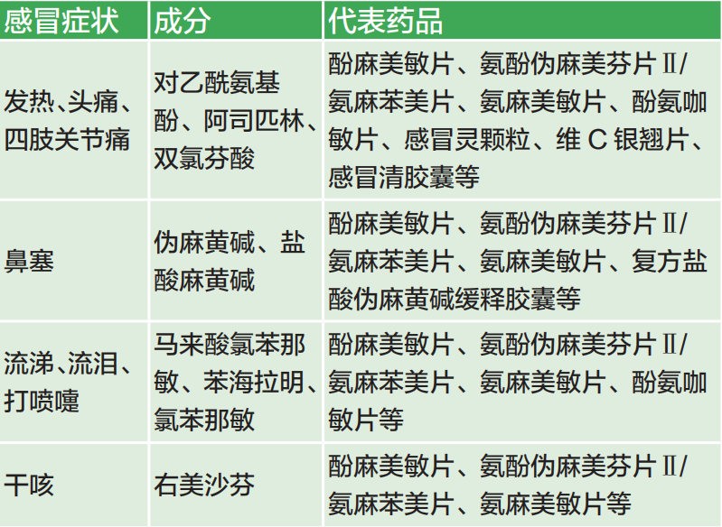 为了可以“一次性”改善所有感冒症状,现在药店里的药品多为复方制剂,即一个药品中含有两种以上的抗感冒成分。不同的症状由其对应的成分进行治疗,比如复方氨酚烷胺胶囊、氨酚伪麻美芬片Ⅱ/氨麻苯美片、酚氨咖敏片等。