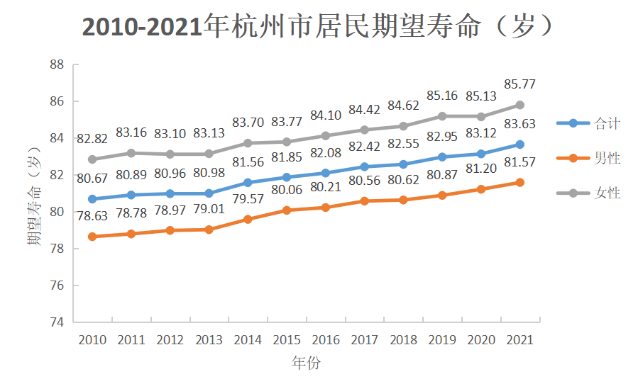 2021年,杭州市户籍人口期望寿命83.63岁,较2010年的80.67岁上升了2.96岁。其中男性为81.57岁,女性为85.77岁。