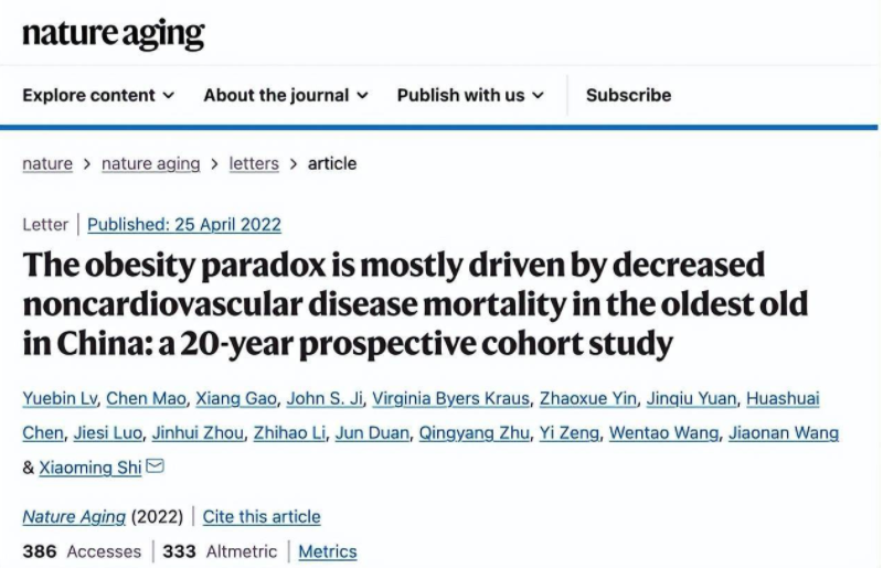 4月25日,中国疾病预防控制中心施小明团队在权威期刊《自然·老化》上发表一篇为期20年的前瞻性队列研究,研究揭示:中国80岁及以上的老人,超重或轻度肥胖者可能更为健康长寿。①