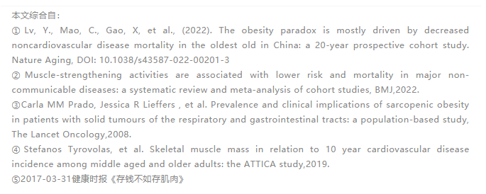 这项研究结果说明,对于无基础疾病的老年人来说,轻度肥胖可能并非坏事。而相反地,体重过低带来的“肌少症”,反而可能危害更大。