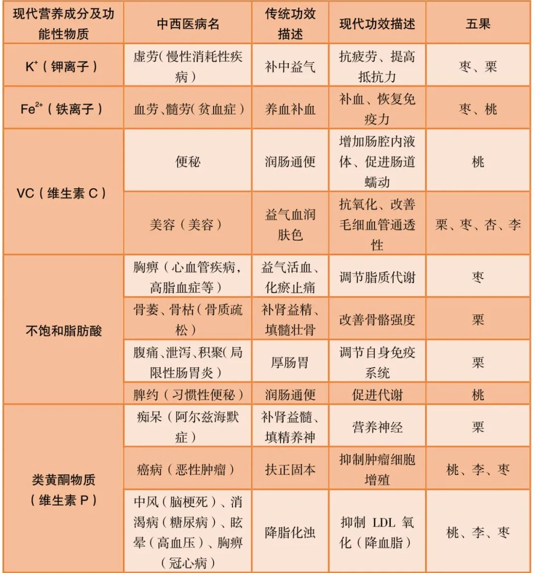 注:将古代文献对“五果”的主要传统功效摘录,同时现代科学将其功能性营养成分拆解得更为清楚,给传统功效以现代营养学支撑。其中中西医病名部分,括号内为西医病名,无括号代表中西医病名一致,参考自《中西医病名对照表》,五果的选择根据对应成分含量的高低优先排列,参考自《中国食物成分表》。