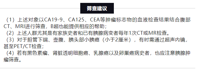 (1)高危人群:建议每6个月行血清CEA、CA19-9和肝胆B超检查;