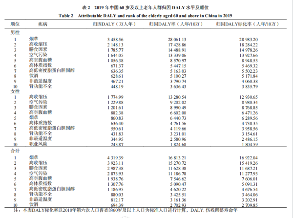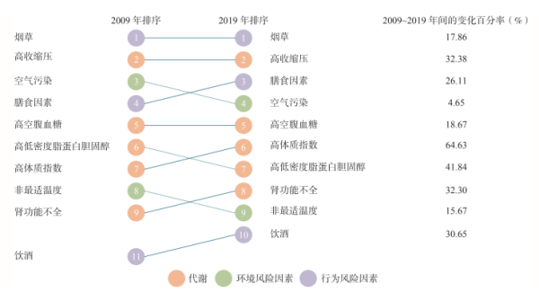另外,与2009年相比,2019年影响中国60岁及以上老年人群健康的危险因素顺序也发生了变化。其中,膳食因素、高体质指数、肾功能不全和饮酒的顺位有所提高,而空气污染、高低密度脂蛋白胆固醇和非最适温度的顺位出现下降。