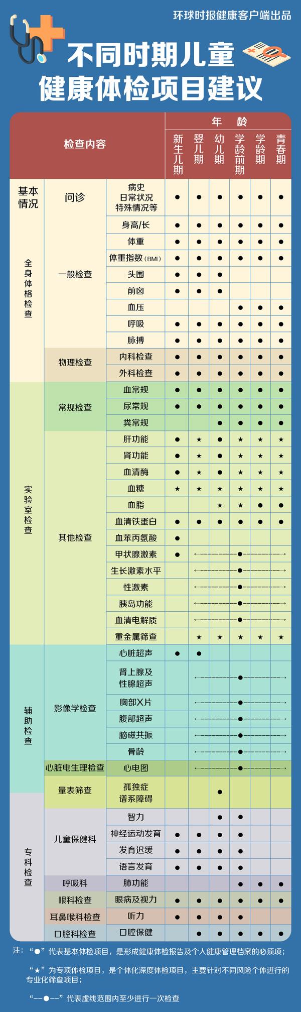 学龄期(7~12岁)。这个年龄段的孩子,体格生长速度相对缓慢,常规体检中需要重视提前发育、视力、听力、龋齿、骨骼畸形等问题的检查,重点排查性早熟、肥胖、矮小等疾病;常规体检外,还可根据家庭和个体情况,选择更深度的检查,如幽门螺杆菌、乙肝五项等。