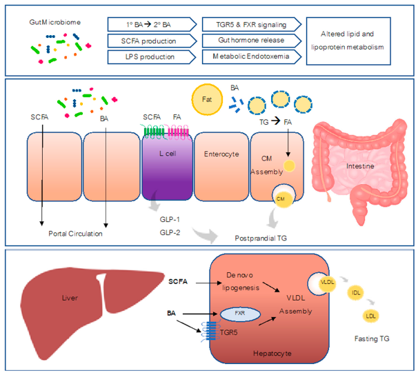 短链脂肪酸和胆汁酸也可以被吸收进入门脉循环。在肝脏中,短链脂肪酸可以作为脂肪从头合成的底物,并促进极低密度脂蛋白的生成。胆汁酸可以激活胆汁酸受体信号通路调节极低密度脂蛋白的组装。极低密度脂蛋白及其产物中间密度脂蛋白和低密度脂蛋白会增加空腹甘油三酯的水平。