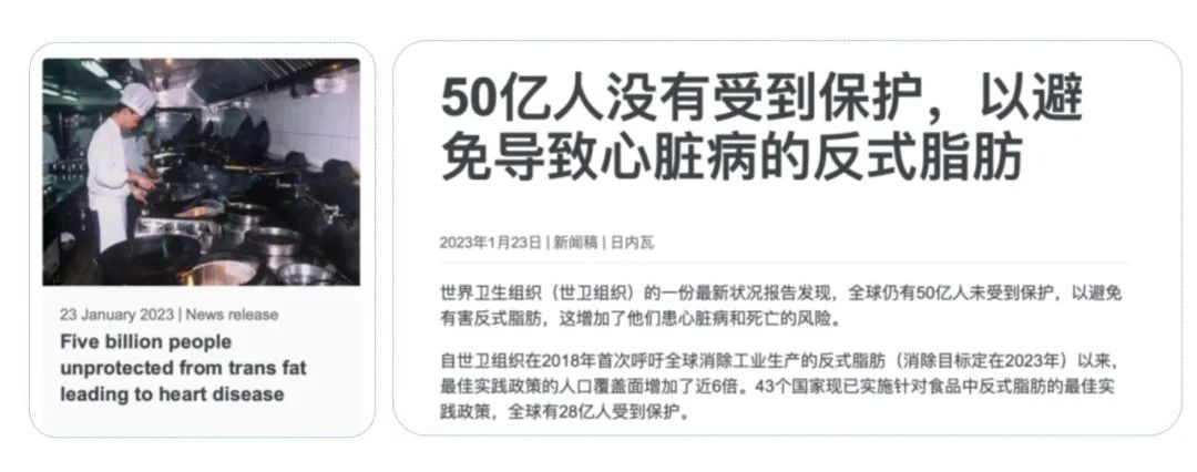 1月23日,世界卫生组织(WHO)发布报告称,目前全球有50亿人的心脏健康受反式脂肪威胁,呼吁严禁在加工食品中出现反式脂肪。