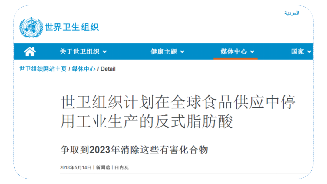 世卫组织总干事谭德塞表示,“反式脂肪是一种致命的有毒化学物质,不应存在于食物中。是时候彻底摆脱它了。”