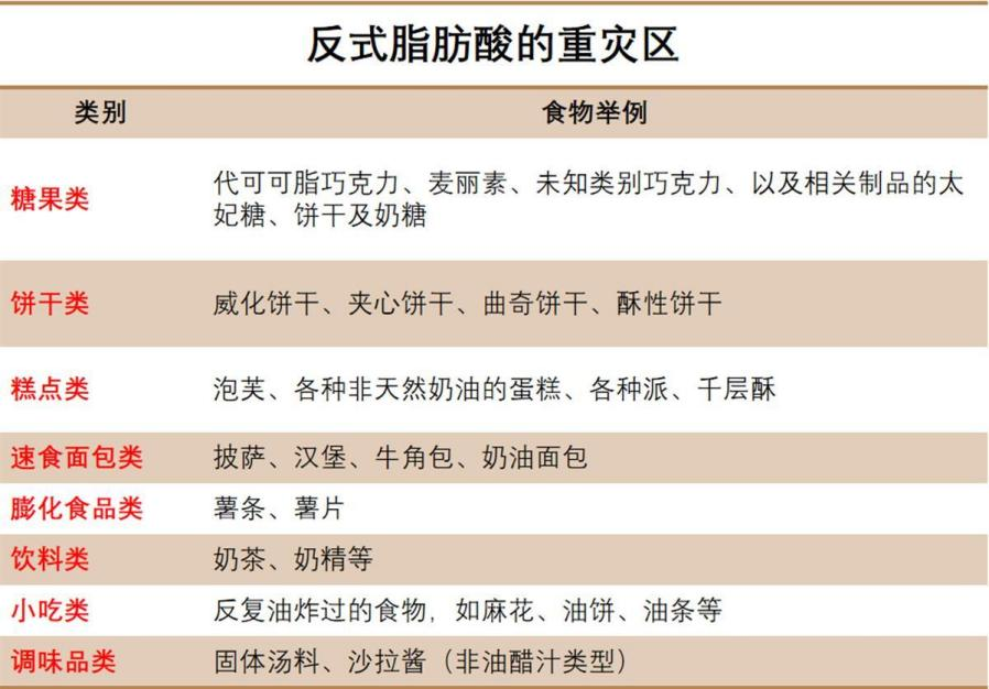 在包装袋的配料表上查找氢化植物油、氢化起酥油、精炼植物油、精炼植脂末、人造奶油、人造酥油、人造黄油、植物黄油、奶精、植脂末、代可可脂等,这些原料广泛存在于蛋糕、巧克力制品、面包和饼干等食品中。
