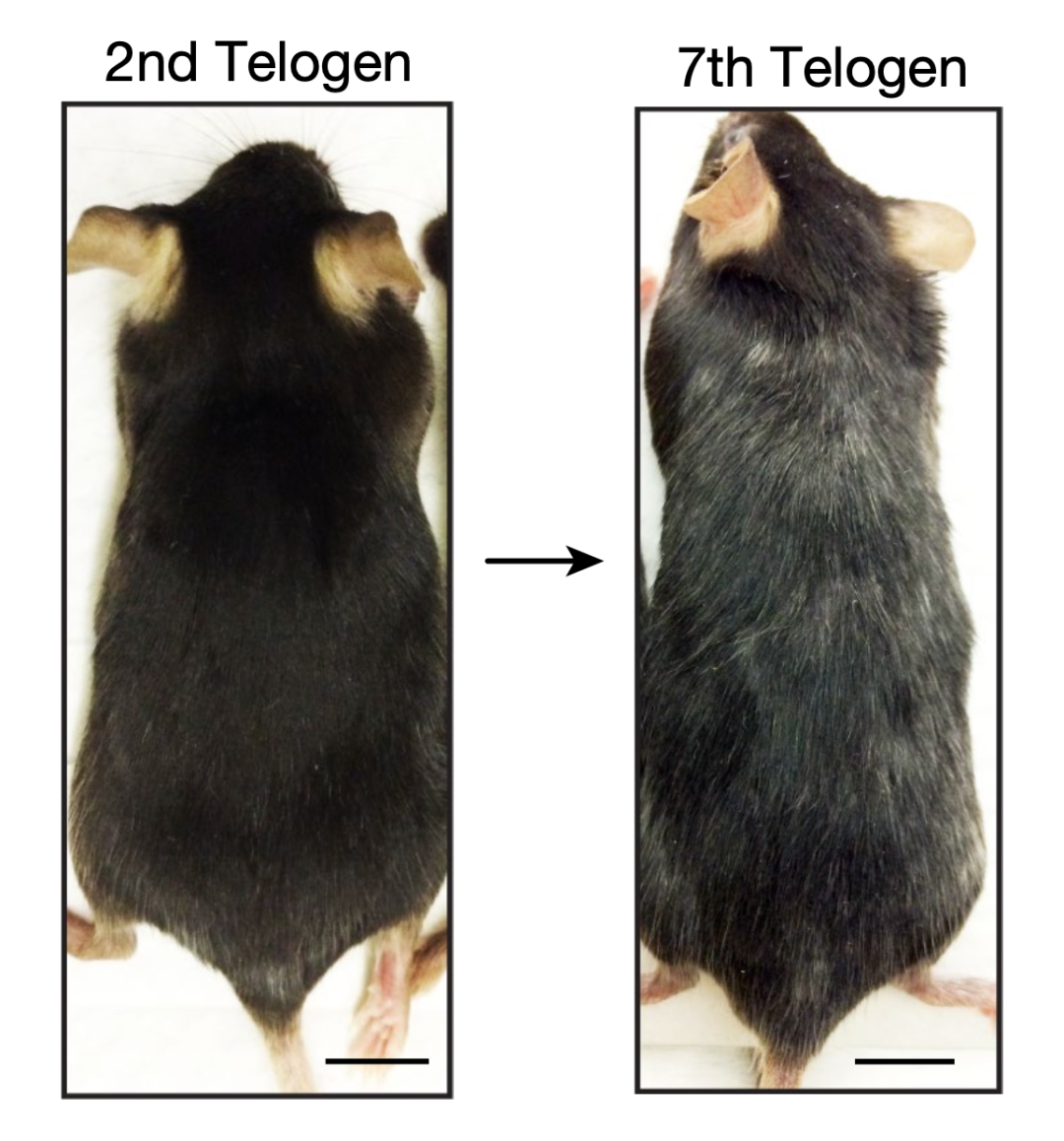 为了验证这一推断,研究团队在两年的时间内,一次又一次地拔掉实验小鼠的毛发,最终培育出了椒盐色(杂黑白色)的老鼠——这几乎与人们常说的“白头发越拔越多”现象一致。研究者表示,拔毛是为了加快小鼠毛发再生、毛囊老化的速度。活体细胞成像和基因测序显示,与没有被拔毛的年轻毛囊相比,老化的毛囊隆突区域的McSCs比例从10%增多到了50%。