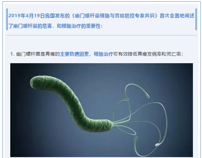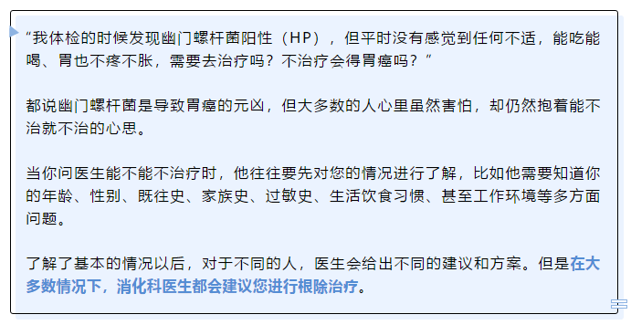 在我国最新出台的《中国幽门螺杆菌根除与胃癌防控的专家共识意见(2019年,上海)》里,也有了更为客观的建议:所有成年人,只要没有抗衡因素,无论有无症状,都建议根除治疗!