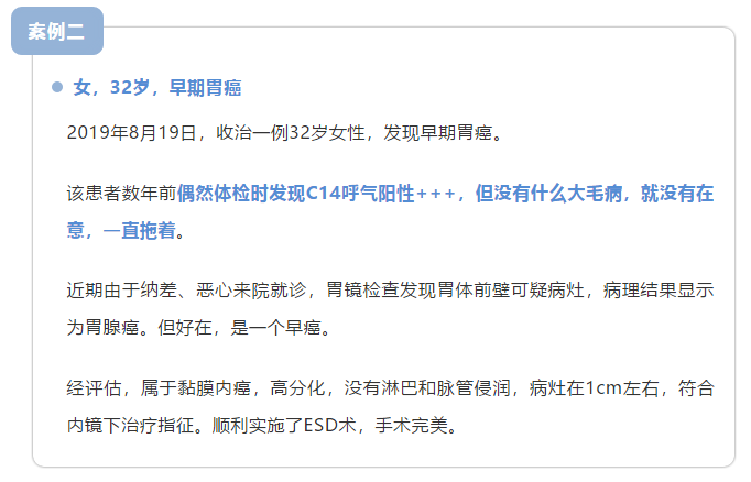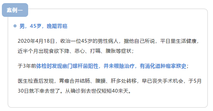 上述的两位患者均在几年前的常规查体中发现了幽门螺杆菌感染,但都因为当时感到不适的症状,所以没有理会,导致后期疾病变化。
