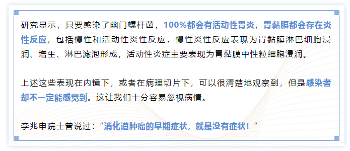 研究表明,HP感染的人中,并不是所有人都会感觉到有症状,但是100%都会在组织学上发生活动性胃炎。
