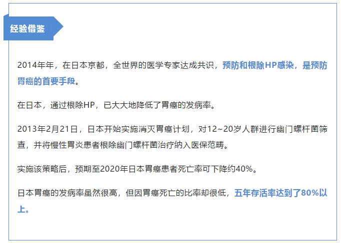 日本也有一项针对有胃溃疡、十二指肠溃疡和胃炎患者的调查结果显示:在10年内,没有感染幽门螺杆菌的患者罹患胃癌的几率为0%,而感染幽门螺杆菌的患者比例则为2.9%。